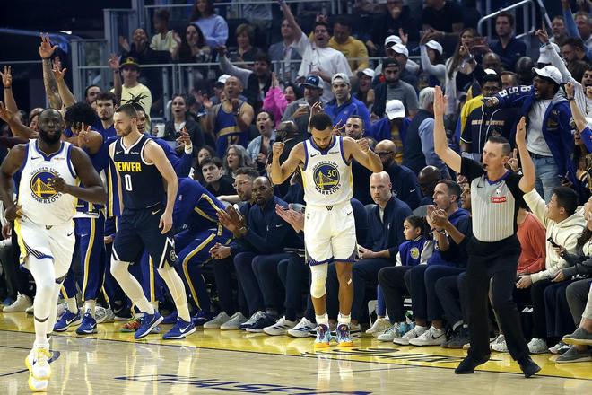 加时赛里,库里先进三分,戈登回敬2+1,约老师打进以后,霍福德三分也有,库明加抢断反击打停掘金。回到比赛,两队打得依旧焦灼,但掘金进攻哑火。巴特勒三分命中领先到了6分,库里空篮打进杀死比赛。